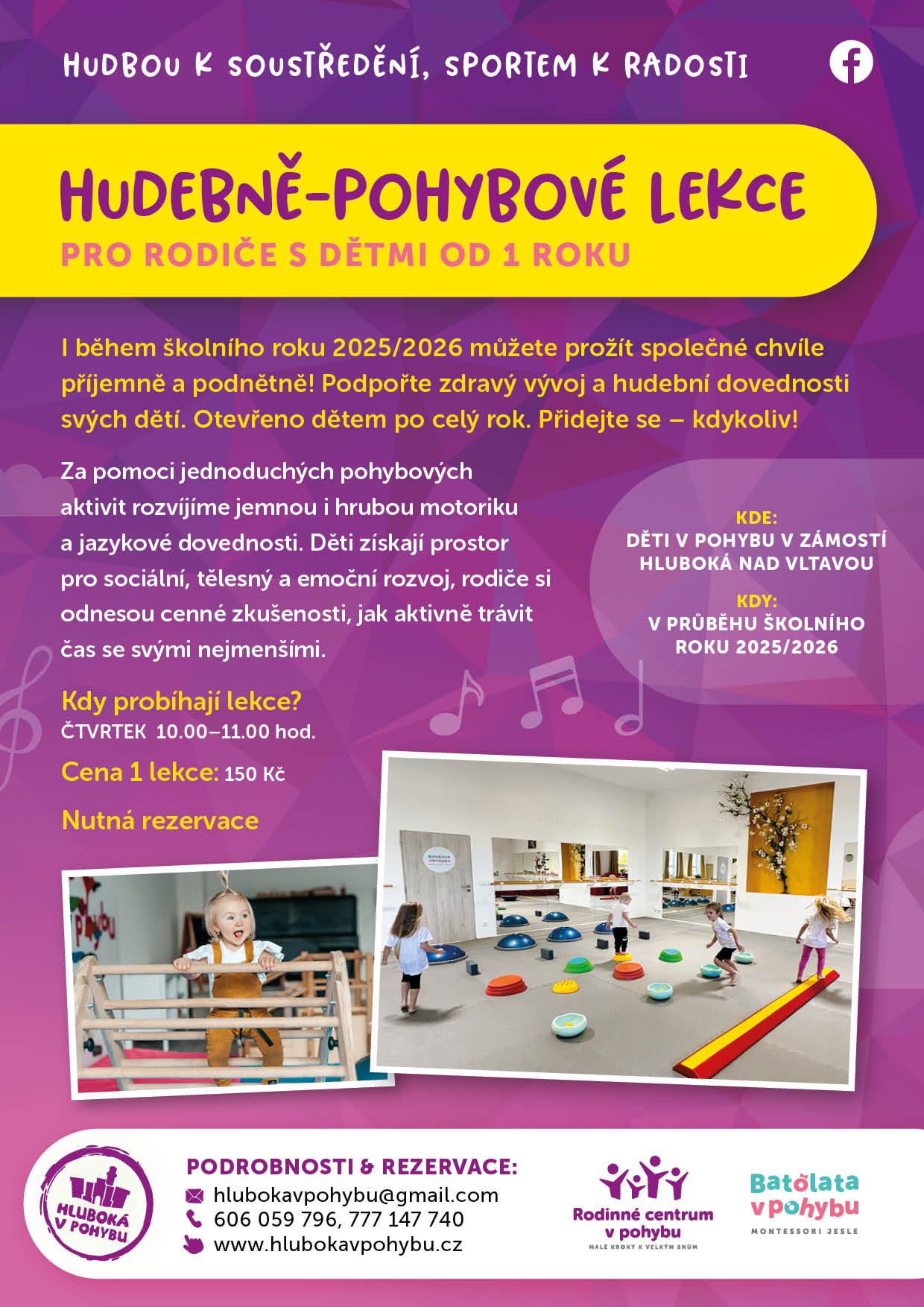 Za pomo­ci jed­no­du­chých pohy­bo­vých akti­vit roz­ví­jí­me jem­nou i hru­bou moto­ri­ku a jazy­ko­vé doved­nos­ti. Děti zís­ka­jí pro­stor pro soci­ál­ní, těles­ný a emoč­ní roz­voj, rodi­če si odne­sou cen­né zku­še­nos­ti, jak aktiv­ně trá­vit čas se svý­mi nejmenšími.